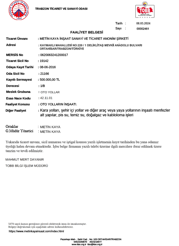 Belgelerimiz Firmamızın sahip olduğu yeterlilik belgesi sayesinde, Metin Kaya İnşaat A.Ş. ile çalışmanın avantajını da sağlamış olacaksınız. Galeri